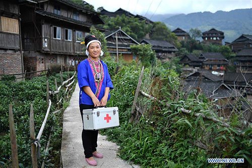 Yang Si, a village doctor of Miao ethnic group, stands in Gaoba Village of Tongle Village in Sanjiang Dong Autonomous County, southwest China's Guangxi Zhuang Autonomous Region, September 21, 2017. Yang has been a village doctor for 16 years and she witnessed the improvement of local transportaion. It is becoming easier for her to visit remote patients. Due to harsh environmental conditions such as the stony desertification and mountainous landform, Guangxi has long been a less developed area in China. In recent years, local government carried out many measurements for the poverty alleviation work. Tens of thousands of officials and staff members helped local people build roads, repair houses, improve education and industry development. In 2016, more than 1.11 million people were liberated from poverty. The poverty-stricken population in the region has declined from 10.12 million in 2010 to current 3.638 million. Photo: Xinhua