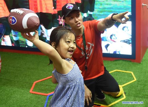 A child plays rugby at a toy expo in Beijing, capital of China, July 11, 2019. The four-day expo kicked off here Thursday at the National Agriculture Exhibition Center. (Xinhua/Luo Xiaoguang)