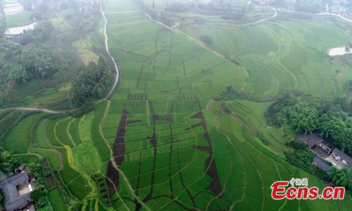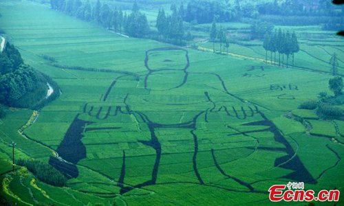 An aerial view of an image of Buddha 100 meters long created in a rice paddy field in Leshan City, Southwest China’s Sichuan Province, July 11, 2019. Photo:China News Service