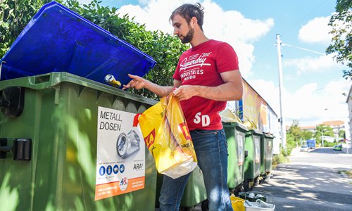 A citizen puts garbage into a garbage bin in Vienna, Austria, July 10, 2019.Photo:Xinhua