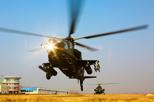 A Z-10 attack helicopter attached to an army aviation brigade under the PLA 80th Group Army hovers at low altitude for last-minute checks during the flight training on November 21, 2017. Photo: eng.chinamil.com.cn