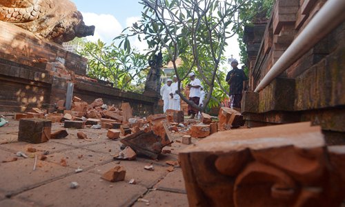 Balinese Hindu men look at a Hindu temple damaged by an earthquake in Denpasar, Bali, Indonesia on Tuesday. An undersea earthquake with a magnitude of 6.1 struck south of Indonesia's Bali on Tuesday, said the European earthquake monitoring agency EMSC, causing some residents and visitors on the tourist island to flee buildings. Photo: VCG
