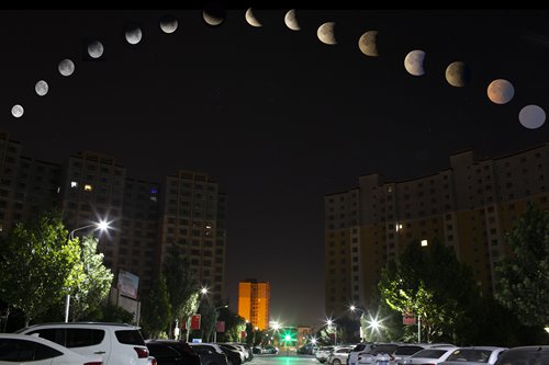 A composite photo shows all the phases of a partial lunar eclipse over a residential community in Kuqa county, Northwest China's Xinjiang Uyghur Autonomous Region, on Wednesday. Photo: IC