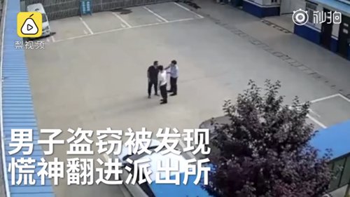 A thief in East China who was startled by the return of the owner of the home he was robbing, tried to make a run for it by jumping over a wall, not realizing the homeowner's neighbor was a police station.