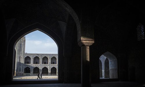 People walk at a mosque in Naghshe Jahan Square in Isfahan, Iran, on July 17, 2019. Constructed between 1598 and 1629, Isfahan is now an important historical site, and one of UNESCO's World Heritage Sites. (Xinhua/Ahmad Halabisaz)
