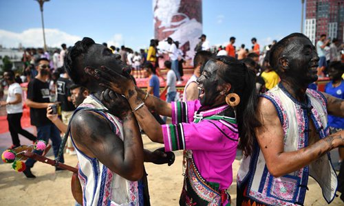 People of the Yi ethnic group daub each other's face during Hualian ("daubed face") Festival in Qiubei County, southwest China's Yunnan Province, July 18, 2019. The Hualian Festival is a traditional annual festival of the Yi ethnic group in Qiubei County where people drive out evil and get good luck by daubing their faces black. (Xinhua/He Chunhao)