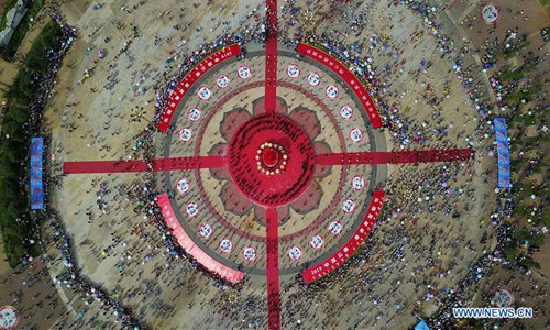 Aerial photo taken on July 18, 2019 shows people of the Yi ethnic group celebrating Hualian ("daubed face") Festival in Qiubei County, southwest China's Yunnan Province. The Hualian Festival is a traditional annual festival of the Yi ethnic group in Qiubei County where people drive out evil and get good luck by daubing their faces black. (Xinhua/He Chunhao)