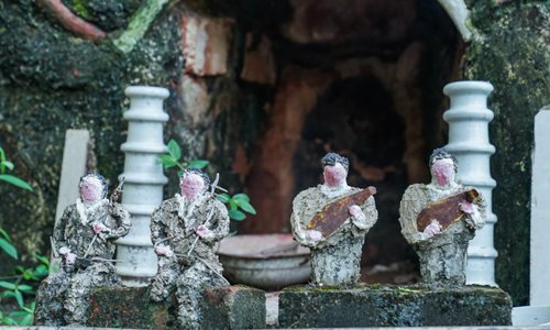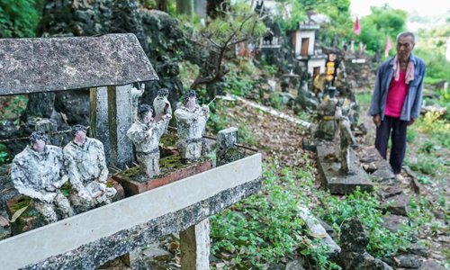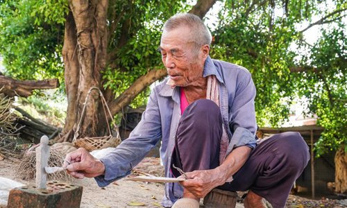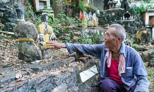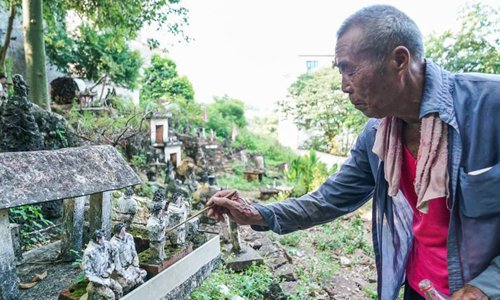 Tan Mingkui, 83, works in his self-made cement craft workshop on a slope in Tongjiang Village, Nanning City, South China’s Guangxi Zhuang Autonomous Region, July 18, 2019. Tan, a big fan of local opera, began to create figures such as animals and characters from operas out of cement and rocks in 2001. As time has passed, he has amassed so many works that a cement figure exhibition of sorts has taken shape in his village. (Photo: China News Service/Chen Guanyan)