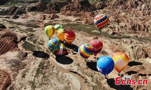 Photo taken on July 19, 2019 shows a gathering of hot air balloons at the Qicai Danxian scenic area in Zhangye City, Northwest China's Gansu Province. One hundred participants riding hot air balloons rose into the sky from three sites in the scenic area famous for Danxian landform, a unique type of geomorphology formed from red-colored sandstone and characterized by steep cliffs.Photo:China News Service