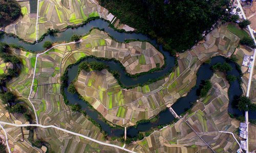 Aerial photo taken on April 13, 2016 shows the Yueliang River winding through the countryside in Wuzhuan Township of Donglan County, south China's Guangxi Zhuang Autonomous Region. Located in south China, Guangxi boasts high forest coverage of over 62 percent and various landforms including its picturesque karst mountains. In recent years, following the principle of building ecological civilization, Guangxi authorities uphold green development in agricultural production and poverty alleviation. Meanwhile, the authorities take various measures to improve rural environment including expanding forest coverage and improving infrastructure construction. From 18 to 20 in July, the "Guangxi Day" event was held at the ongoing Beijing International Horticultural Exhibition, where visitors can experience the sheer beauty and remarkable achievements of Guangxi. (Xinhua/Huang Xiaobang)