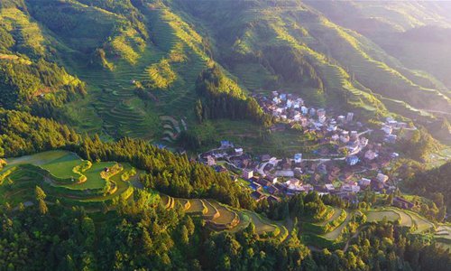 Aerial photo taken on June 19, 2019 shows the view of Guijiang Miao Village of Rongshui Miao Autonomous County, south China's Guangxi Zhuang Autonomous Region. Located in south China, Guangxi boasts high forest coverage of over 62 percent and various landforms including its picturesque karst mountains. In recent years, following the principle of building ecological civilization, Guangxi authorities uphold green development in agricultural production and poverty alleviation. Meanwhile, the authorities take various measures to improve rural environment including expanding forest coverage and improving infrastructure construction. From 18 to 20 in July, the "Guangxi Day" event was held at the ongoing Beijing International Horticultural Exhibition, where visitors can experience the sheer beauty and remarkable achievements of Guangxi. (Xinhua/Huang Xiaobang)