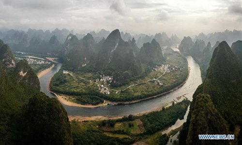 Stitched aerial photo taken on Oct. 18, 2018 shows a view of Lijiang River in Xingping Township in Yangshuo County, south China's Guangxi Zhuang Autonomous Region. Located in south China, Guangxi boasts high forest coverage of over 62 percent and various landforms including its picturesque karst mountains. In recent years, following the principle of building ecological civilization, Guangxi authorities uphold green development in agricultural production and poverty alleviation. Meanwhile, the authorities take various measures to improve rural environment including expanding forest coverage and improving infrastructure construction. From 18 to 20 in July, the "Guangxi Day" event was held at the ongoing Beijing International Horticultural Exhibition, where visitors can experience the sheer beauty and remarkable achievements of Guangxi. (Xinhua/Li Xin)