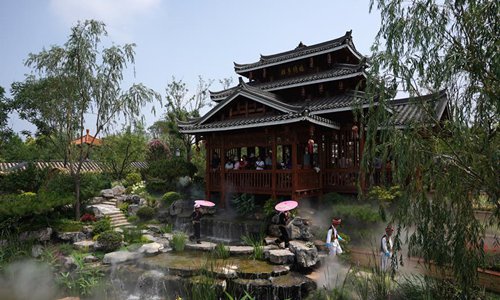 Tourists visit the Guangxi Garden at the Beijing International Horticultural Exhibition in Beijing, capital of China, July 18, 2019. Located in south China, Guangxi boasts high forest coverage of over 62 percent and various landforms including its picturesque karst mountains. In recent years, following the principle of building ecological civilization, Guangxi authorities uphold green development in agricultural production and poverty alleviation. Meanwhile, the authorities take various measures to improve rural environment including expanding forest coverage and improving infrastructure construction. From 18 to 20 in July, the "Guangxi Day" event was held at the ongoing Beijing International Horticultural Exhibition, where visitors can experience the sheer beauty and remarkable achievements of Guangxi. (Xinhua/Ju Huanzong)