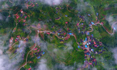 Aerial photo taken on July 7, 2019 shows the view of Dangjiu Miao Village in Rongshui Miao Autonomous County, south China's Guangxi Zhuang Autonomous Region. Located in south China, Guangxi boasts high forest coverage of over 62 percent and various landforms including its picturesque karst mountains. In recent years, following the principle of building ecological civilization, Guangxi authorities uphold green development in agricultural production and poverty alleviation. Meanwhile, the authorities take various measures to improve rural environment including expanding forest coverage and improving infrastructure construction. From 18 to 20 in July, the "Guangxi Day" event was held at the ongoing Beijing International Horticultural Exhibition, where visitors can experience the sheer beauty and remarkable achievements of Guangxi. (Xinhua/Huang Xiaobang)