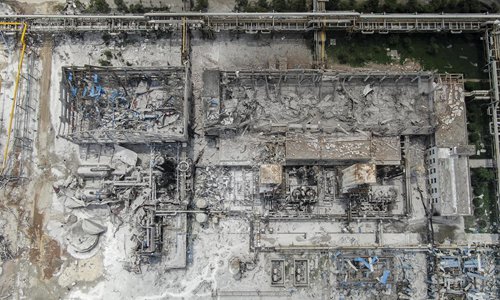 An aerial view of the devastated coal-to-gas factory where an explosion on Friday afternoon killed 15 in Yima, Sanmenxia in Central China's Henan Province Photo: VCG