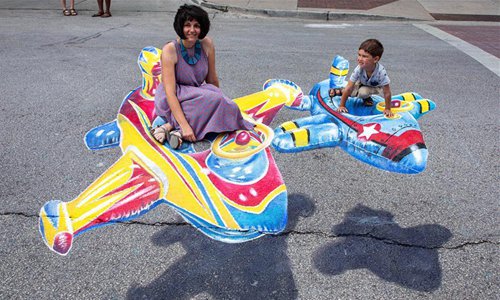 People pose for photos with a 3D chalk drawing of a flying plane during the Chalk Howard Street Festival in Chicago, the United States, July 20, 2019. The Chalk Howard Street Festival attracts the internationally-renowned 3D street artists, local 2D chalk artists as well as emerging artists. (Xinhua/Joel Lerner)