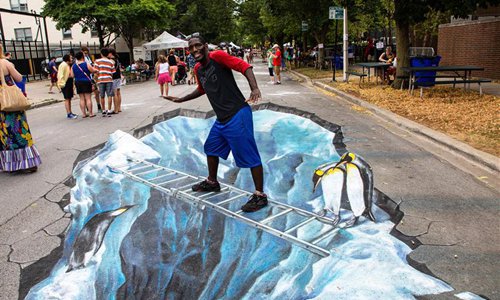 A man poses for photos with a 3D chalk drawing during the Chalk Howard Street Festival in Chicago, the United States, July 20, 2019. The Chalk Howard Street Festival attracts the internationally-renowned 3D street artists, local 2D chalk artists as well as emerging artists. (Xinhua/Joel Lerner)