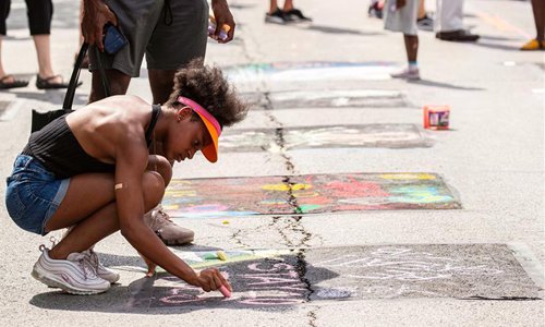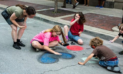 Children chalk drawings during the Chalk Howard Street Festival in Chicago, the United States, July 20, 2019. The Chalk Howard Street Festival attracts the internationally-renowned 3D street artists, local 2D chalk artists as well as emerging artists. (Xinhua/Joel Lerner)