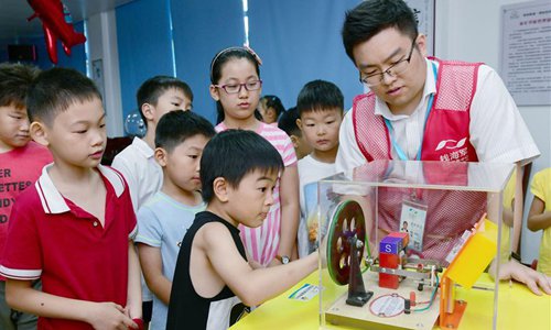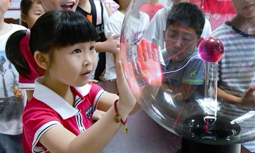 A pupil tries a plasma magic ball under the instruction of volunteers in Cixi City, east China's Zhejiang Province, July 22, 2019. A volunteer center in Cixi City opened science courses for local pupils to help them learn scientific knowledge and enrich their summer vacation. (Xinhua/Xu Yu)