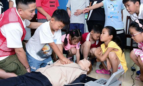 Pupils learn how to do CPR under the instruction of a volunteer in Cixi City, east China's Zhejiang Province, July 22, 2019. A volunteer center in Cixi City opened science courses for local pupils to help them learn scientific knowledge and enrich their summer vacation. (Xinhua/Xu Yu)