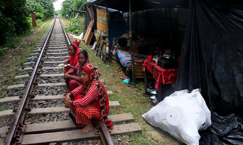 Women shelter beside the railway track following heavy monsoon rains in Tangail, Bangladesh on Tuesday. Over 1 million people have been affected by floods triggered by the monsoon rains and overflowing river in the north, northeastern and hilly regions of Bangladesh. Photo: VCG