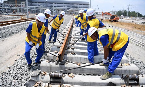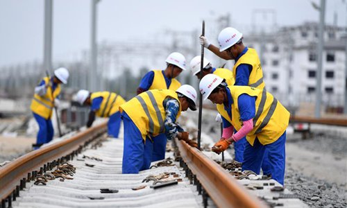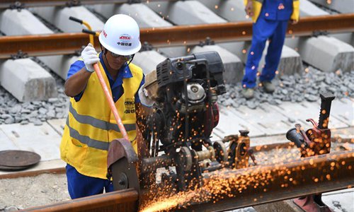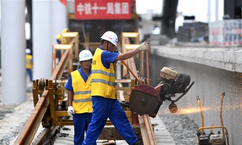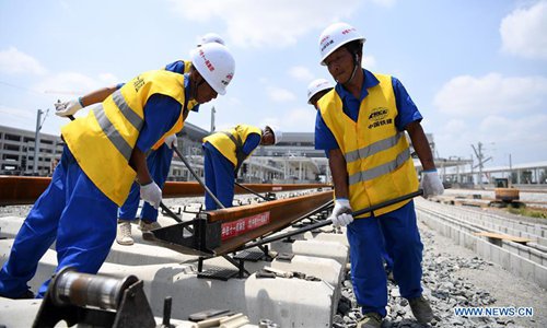 Construction workers pave rails on the Shangqiu-Hefei-Hangzhou High-speed Railway in Fuyang, east China's Anhui Province, July 24, 2019. The last 500-meter steel rail of the Hefei north section on the Shangqiu-Hefei-Hangzhou High-speed Railway was paved on Wednesday, which means the Hefei north section of the railway was completed, paving the way for the operation of the Shangqiu-Hefei-Hangzhou high-speed railway in 2020. (Xinhua/Liu Junxi)