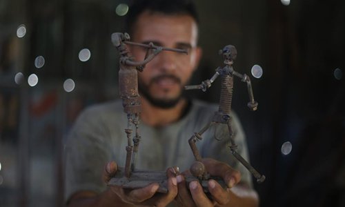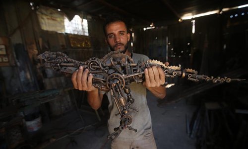 Palestinian Anas Hilles displays art pieces made with iron at his workshop in Gaza City, July 24, 2019. Anas Hilles, 27, has been working as a blacksmith for 10 years. He creates beautiful artifacts and sculpture with iron. (Photo by Khaled Omar/Xinhua)