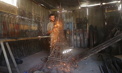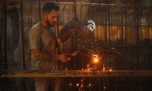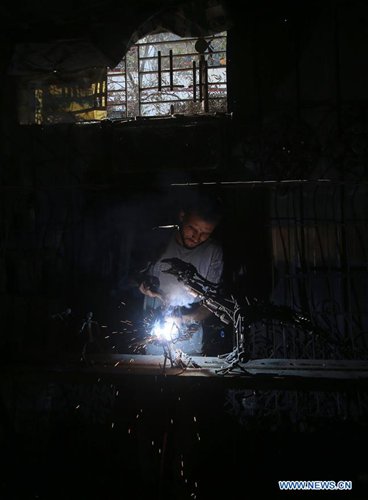 Palestinian Anas Hilles makes an art piece with iron at his workshop in Gaza City, July 24, 2019. Anas Hilles, 27, has been working as a blacksmith for 10 years. He creates beautiful artifacts and sculpture with iron. (Photo by Khaled Omar/Xinhua)