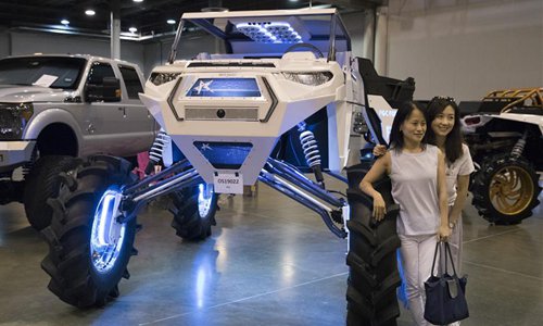 People pose for photos with a customized vehicle at the Omni12 Car Show in Houston, Texas, the United States, on July 28, 2019. The inaugural Omni12 Car Show provided a platform for showing and trading automotive aftermarket products, including tires, body parts, electronics, painting and more. (Photo by Yi-Chin Lee/Xinhua)