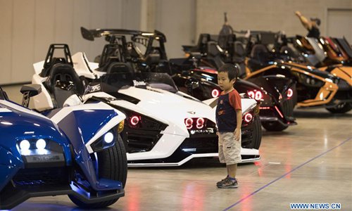 A boy views a row of customized Polaris Slingshot vehicles on display at the Omni12 Car Show in Houston, Texas, the United States, on July 28, 2019. The inaugural Omni12 Car Show provided a platform for showing and trading automotive aftermarket products, including tires, body parts, electronics, painting and more. (Photo by Yi-Chin Lee/Xinhua)