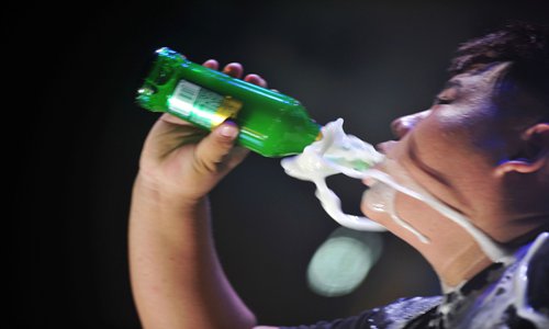 A competitor gulps down a bottle of beer on Tuesday during the 29th Qingdao International Beer Festival in Qingdao, East China's Shandong Province. Six competitors advanced to the finals. The fastest drinker finished a beer in four seconds. Photo: IC