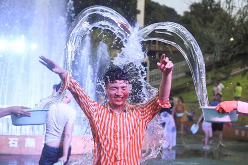 A man in Changsha, Central China's Hunan Province gets cooled off during a water-sprinkling festival on Wednesday. Temperatures soared to 37 C in the city on Thursday. Photo: VCG