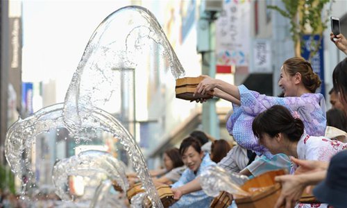 People in traditional costumes splash water during the Uchimizu water sprinkling event in Tokyo, Japan, Aug. 3, 2019. Uchimizu is a summer tradition meant to cool down the air as the water evaporates. (Xinhua/Du Xiaoyi)