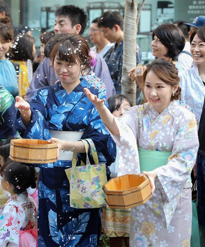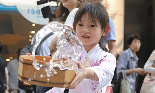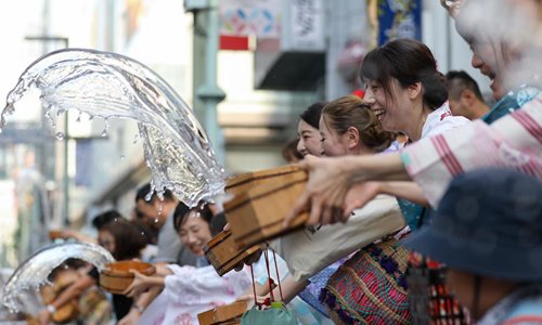 A girl in traditional costume splashes water during the Uchimizu water sprinkling event in Tokyo, Japan, Aug. 3, 2019. Uchimizu is a summer tradition meant to cool down the air as the water evaporates. (Xinhua/Du Xiaoyi)