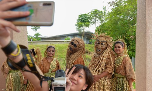 A visitor poses for photos with artists of a Malaysian indigenous art group during the Selangor International Indigenous Art Festival 2019 in Shah Alam, Malaysia, Aug. 3, 2019. Visitors will be able to get a closer look at indigenous customs, culture, artwork and crafts during the two-day event that kicked off on Saturday. (Photo by Chong Voon Chung/Xinhua)