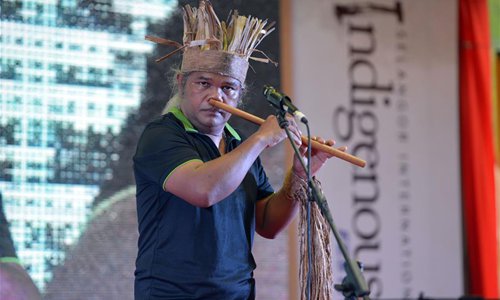 A Malaysian indigenous nose fluter performs during the Selangor International Indigenous Art Festival 2019 in Shah Alam, Malaysia, Aug. 3, 2019. Visitors will be able to get a closer look at indigenous customs, culture, artwork and crafts during the two-day event that kicked off on Saturday. (Photo by Chong Voon Chung/Xinhua)