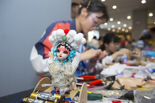 Teen competitors from the island of Taiwan and East China's Jiangsu Province on Saturday make a mini electric vehicle with a model of a traditional Chinese opera singer on display at the youth science and technology innovation competition. Photo: VCG