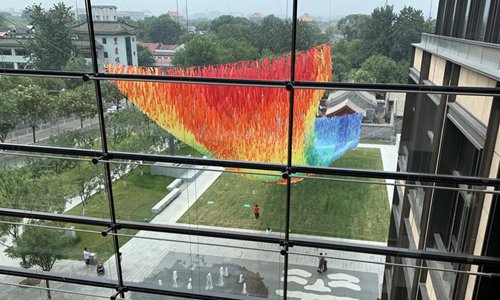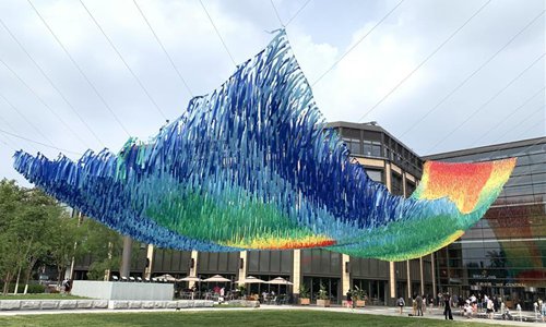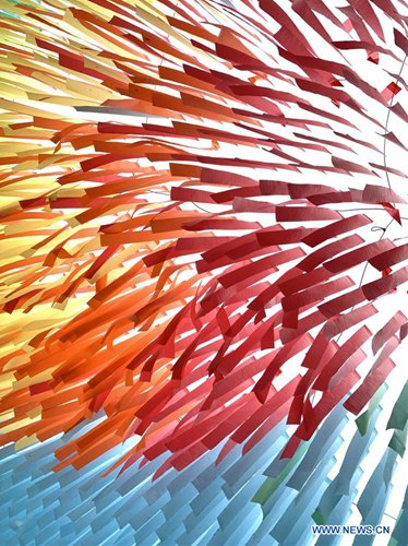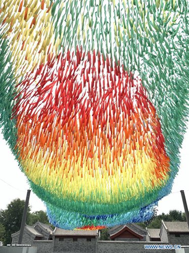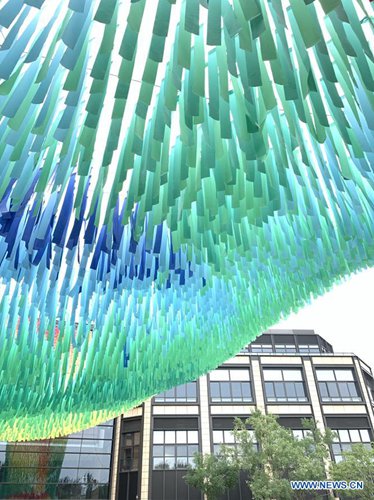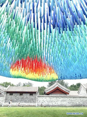 Mobile photo taken on Aug 3, 2019 shows people enjoying themselves under the installation artwork "Sun Cycle" displayed at Wangfujing, Beijing, capital of China. The artwork "Sun Cycle" is displayed at WF Central, a shopping mall in Wangfujing, from May 29 to Aug 31. (Xinhua/An Xiya)