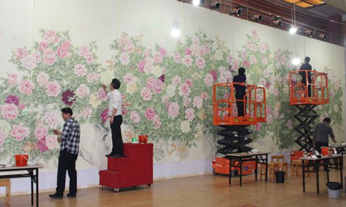 Artists from the Juye Painting and Calligraphy Institute work on the Blossom in Prosperity for the Shanghai Cooperation Organization Qingdao Summit in East China's Shandong Province. Photo: Courtesy of Juye Painting and Calligraphy Institute