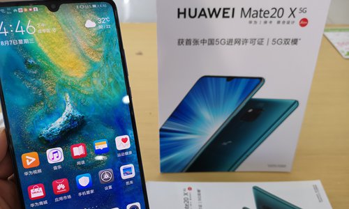 Huawei's first 5G smartphone, the Mate 20X (5G), is seen on sale in a China Mobile store in Chengdu, capital of Southwest China's Sichuan Province. The smartphone, which is equipped with 8GB of RAM and 256GB of internal storage, is priced at 4,499 yuan ($693). Chengdu is strengthening efforts to advance the 5G industry, aiming to build more than 40,000 5G base stations by 2022. Photo: IC