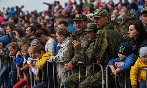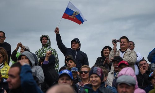 People watch the competition during "Engineering formula" contest of the International Army games 2019 in Tyumen, Russia, Aug. 10, 2019. The International Army Games 2019 runs from Aug. 3 to 17. (Xinhua/Evgeny Sinitsyn)