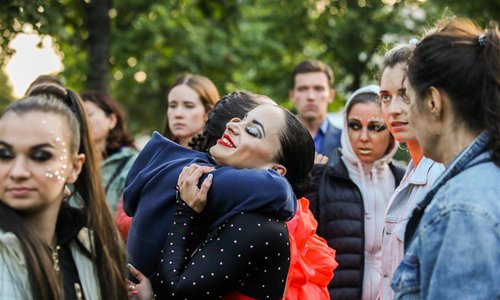 A gymnast is cheered by her collegue after participating in during an Aerial Gymnastics Festival in Gorky Park, Moscow, Russia, on Aug. 10, 2019. The competition was held in 3 different categories: canvas, ring and alternative accessories. (Xinhua/Maxim Chernavsky)
