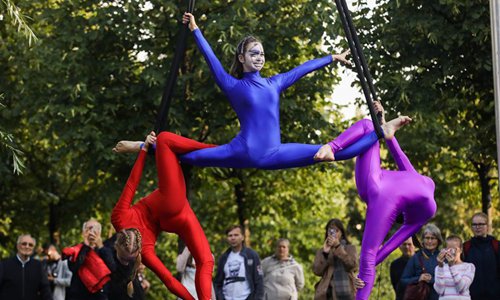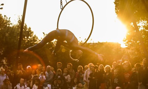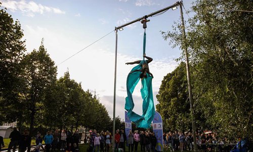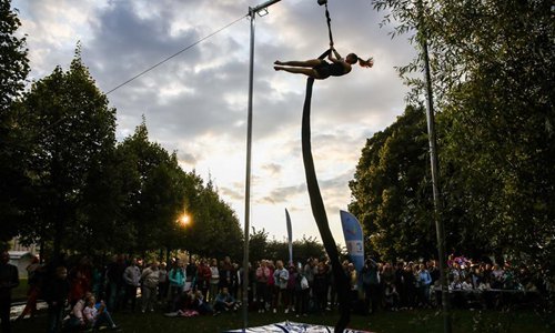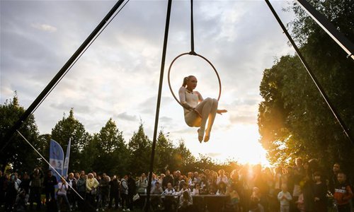 A gymnast participates in a competition using a ring during an Aerial Gymnastics Festival in Gorky Park, Moscow, Russia, on Aug. 10, 2019. The competition was held in 3 different categories: canvas, ring and alternative accessories. (Xinhua/Maxim Chernavsky)