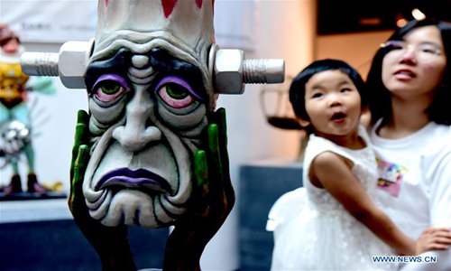 People visit a wood carving exhibition at Sanyi Woodcarving Museum in Miaoli County, southeast China's Taiwan, Aug. 10, 2019. A total of 67 exhibits were on display here. (Xinhua/Zhu Xiang)