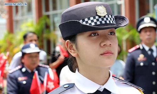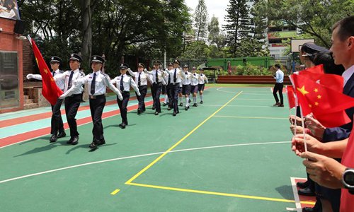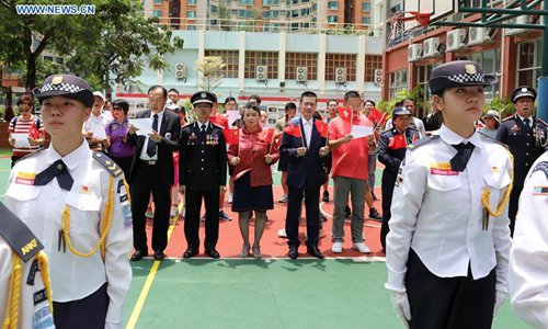 People attend a flag raising ceremony at a middle school in Yuen Long of New Territories, Hong Kong, south China, Aug. 11, 2019. The Association of Hong Kong Flag-guards held a flag raising ceremony at a middle school on Sunday. (Xinhua/Wu Xiaochu)