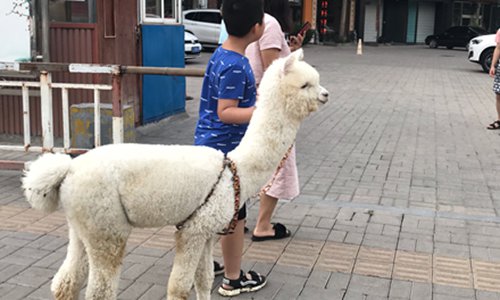 Residents of Taiyuan, North China's Shanxi Province keep an alpaca as their pet and take it for a walk after dinner on Sunday. Photo: IC