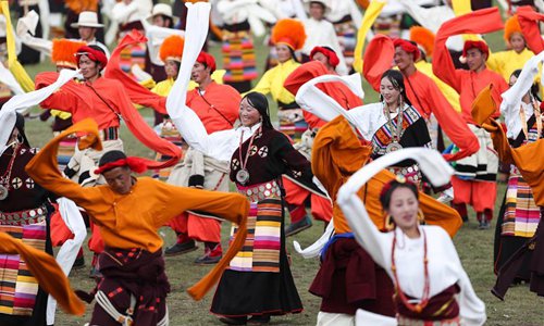 People perform Guozhuang dance, or Tibetan bonfire dance, on the opening ceremony of a horse racing festival in Litang County, southwest China's Sichuan Province, July 30, 2019. Photo: Xinhua