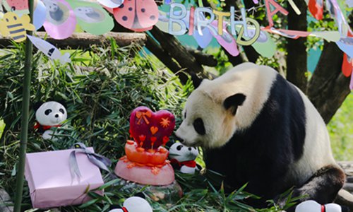 Panda Tao Tao celebrates his 13th birthday on Monday at a panda training base in Guang'an, Southwest China's Sichuan Province. People from around the country sent it many birthday presents. Photo: VCG