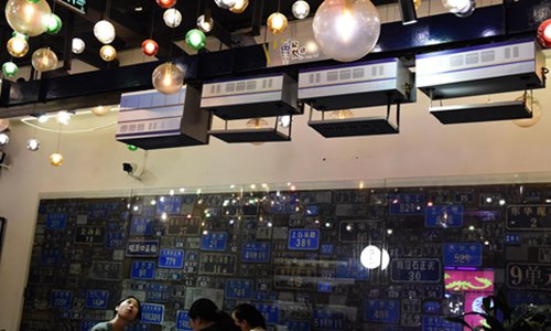 A train on the ceiling of a restaurant in Southwest China's Chongqing Municipality delivers dishes to customers. Photo: VCG