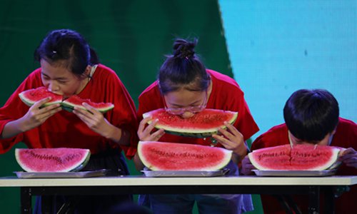 Three children participate in a watermelon eating contest at the 6th watermelon festival in Jishou, Central China's Hunan Province on Tuesday. Photo: VCG